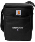 Designed with a vertical shape to fit in any worker's or student's locker, this seam-sealed cooler delivers by keeping your favorite beverages chilled and handy.. 600D polyester. Rain Defender durable water repellent (DWR). Seam-sealed to prevent ice from leaking as it melts. Fully insulated main compartment can hold up to twelve 12-ounce cans. Front zippered pocket. Adjustable shoulder strap. Carhartt label sewn on front. Dimensions: 11"h x 8"w x 5.75"l. Note: Bags not intended for use by children 12 and under.
