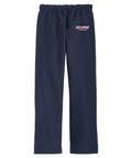 50/50 cotton/poly, Covered elastic waistband with drawcord, Slightly tapered leg with open bottom
