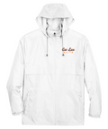 1.7 oz/yd2 / 58 gsm, 100% polyester taffeta Water-resistant finish Center front coil zipper with autolock slider Lower front concealed zippered pockets Elasticized cuffs Rollaway adjustable hood Adjustable shockcord at hem Deco Eligible