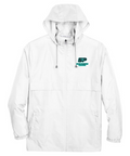1.7 oz/yd2 / 58 gsm, 100% polyester taffeta Water-resistant finish Center front coil zipper with autolock slider Lower front concealed zippered pockets Elasticized cuffs Rollaway adjustable hood Adjustable shockcord at hem Deco Eligible