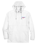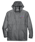 1.7 oz/yd2 / 58 gsm, 100% polyester taffeta Water-resistant finish Center front coil zipper with autolock slider Lower front concealed zippered pockets Elasticized cuffs Rollaway adjustable hood Adjustable shockcord at hem Deco Eligible