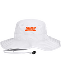 100% polyester, Unisex, Unstructured, Performance sweatband, UPF 30 Ultra-violet protection (White is UPF 25), Sewn eyelets, Adjustable drawcord and toggle at back