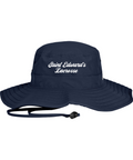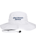 100% polyester, Unisex, Unstructured, Performance sweatband, UPF 30 Ultra-violet protection (White is UPF 25), Sewn eyelets, Adjustable drawcord and toggle at back